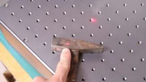 The first way is to use the traditional method using red dots. By pressing the switch on the laser head, you turn on the two laser pointers below, which are projecting two dots on the surface. The third dot is projected through the lens itself. Then, you can use the electric lift to adjust the Z-axis height. The machine is in perfect focus when all three dots are aligned.