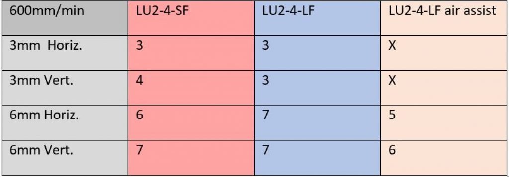 With both LU2-4 heads having the same output power, this should mean that the long focus diode should have a slight advantage for laser cutting.